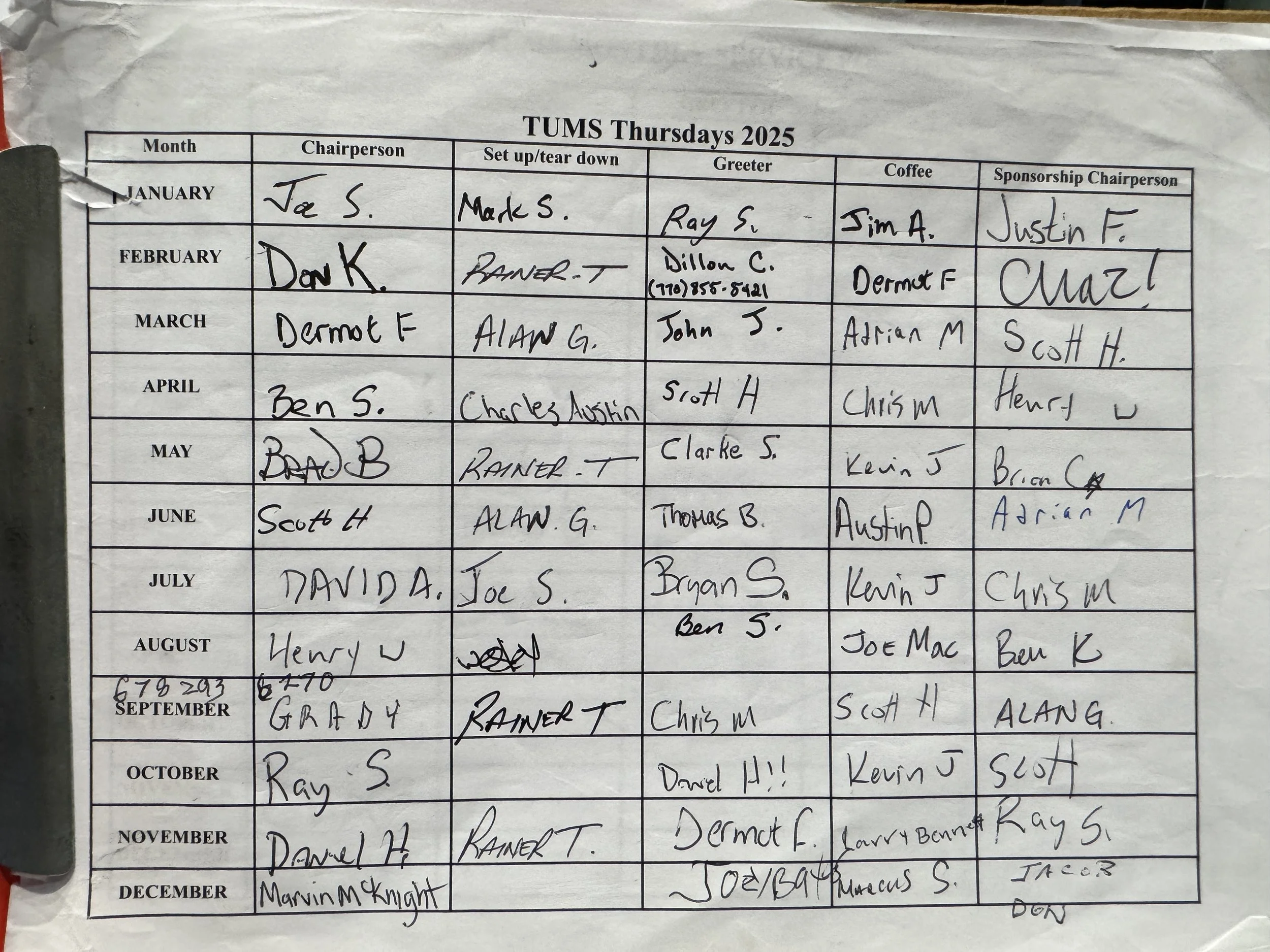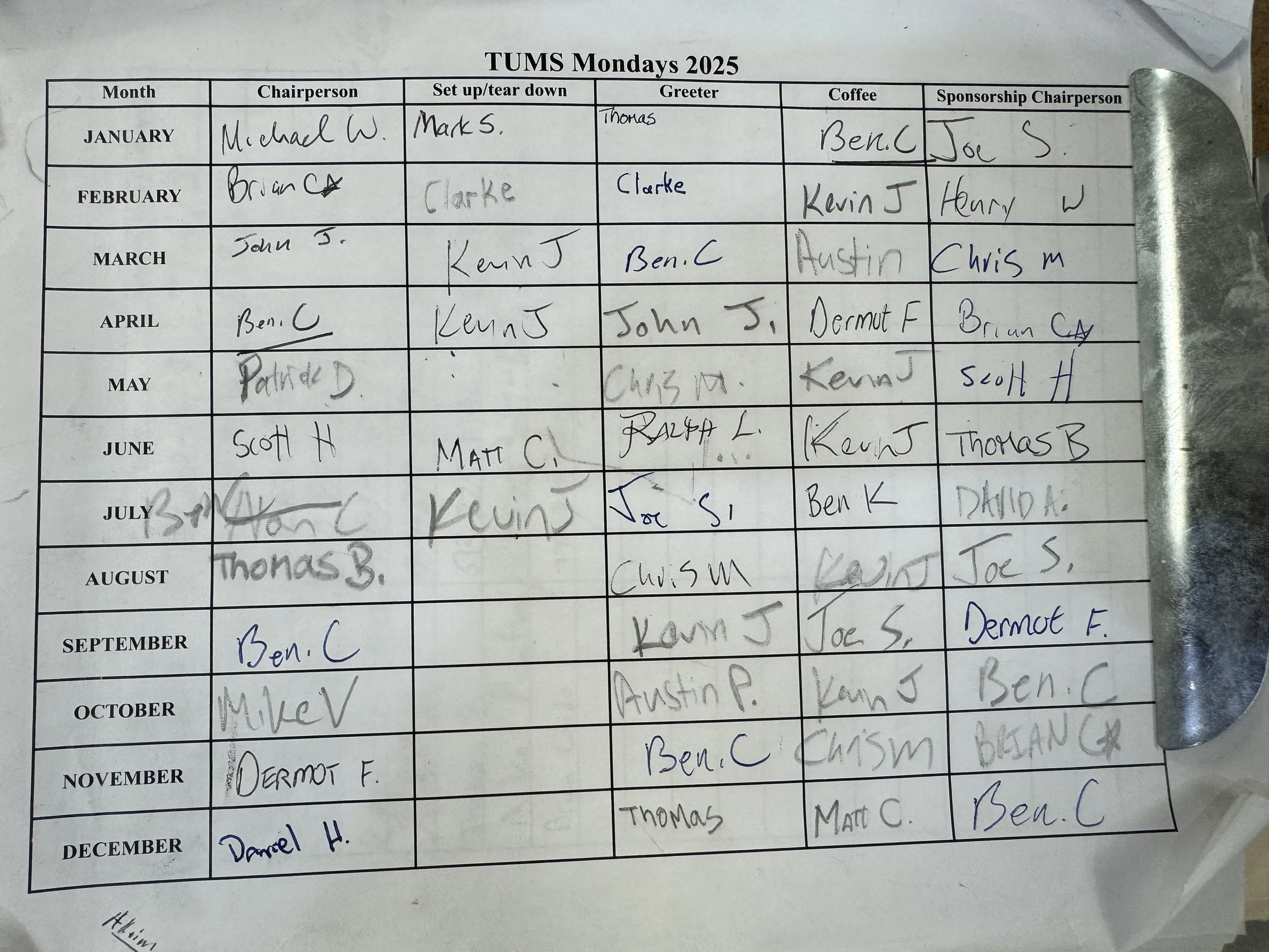 Attention service volunteers: in the spirit of AAs third legacy, service is important to our group. If you signed up but cannot keep your commitment, please contact a fellow AA to replace you. If you are unaware of the TUMS commitment you signed up for, please see the current meeting chairperson who can show you the information. Thank you.
